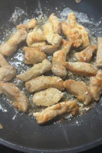 - Pat chicken dry using paper towels; cut into 1 inch strips.